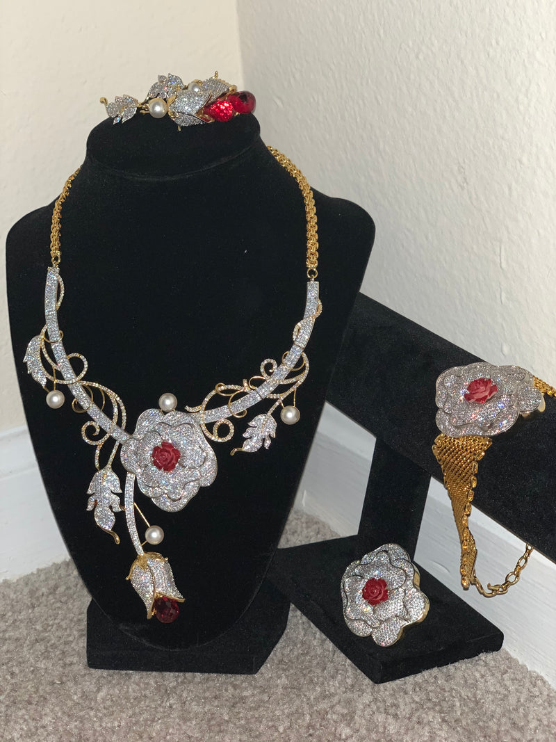 our necklace set comes in different designs and shape we have full set which comprise the necklace ,earring , bangle and ring.
