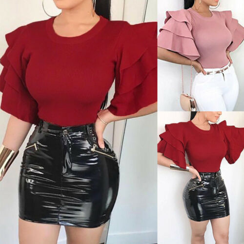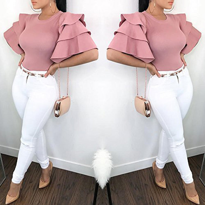 Sexy Women Multi-Layer Ruffle Wide Sleeve T-Shirt Casual Slim Solid Top Shirt Summer Streetwear Blouses