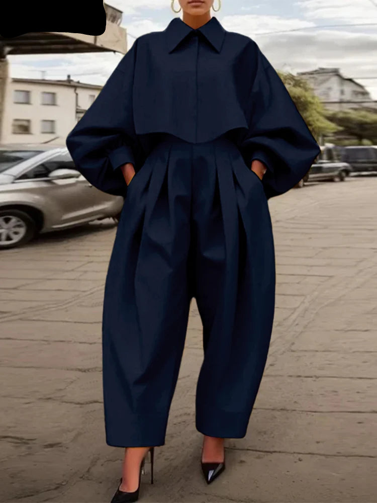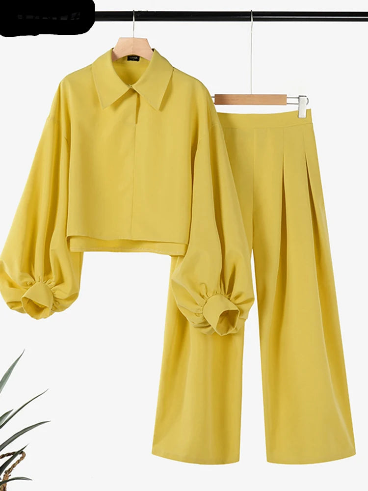 Women Pants Sets Casual Loose Turn-down Collar Tops Elastic Waist Wide Leg Pant Outfits Suits